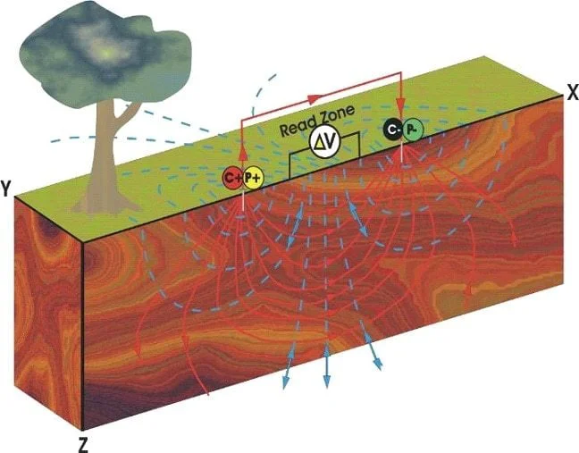 Los principios básicos de la resistividad:Una encuesta de resistividad se realiza colocando sondas de metal en el suelo y se hace pasar una corriente eléctrica entre ellas. La resistencia de la corriente se mide en ohmios. Dependiendo de la resistencia que encuentre la corriente, se pueden identificar diferentes anomalías subterráneas.